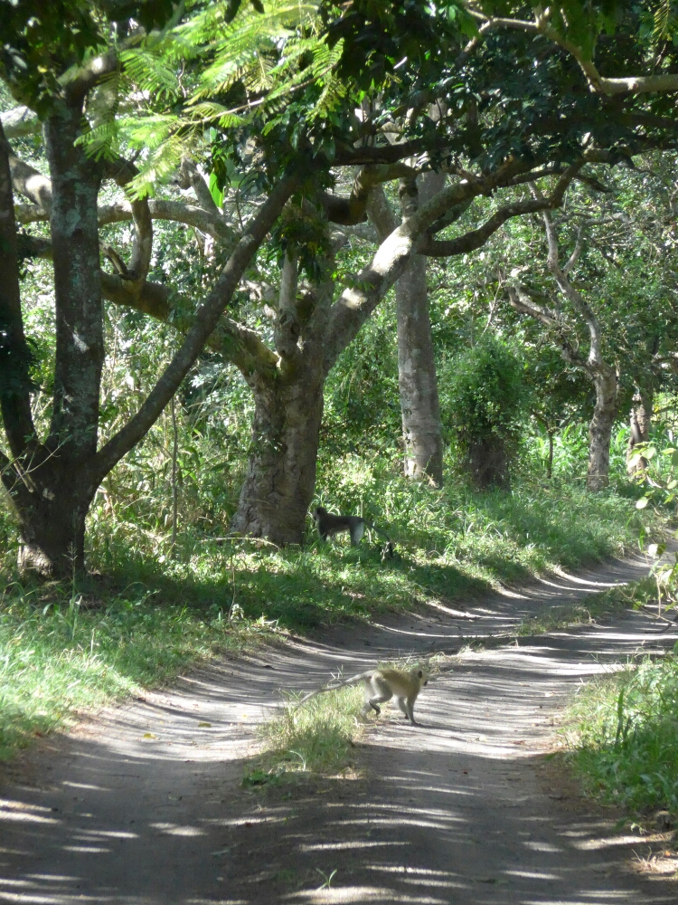 Gestern Nachmittag schickte mich ein angeblich 4 km langer schmaler Auf- und Abtrail durch den geschützten Küstenwald entlang der Umulalazi-Lagune zur Flussmündung am Meer. Immer wieder huschte irgendwas weg, seltsame Vogelschreie waren zu hören, aber kaum was von den Tieren zu sehen. Ungewohnt große Schmetterlinge tanzten in den Wiesen der Lichtungen.