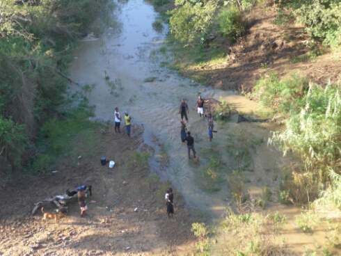 Am nächsten Tag gehts zuerst 28 km Stichstraße von St. Lucia wieder zurück, zur N2, der einzigen Direktverbindung nach Norden, also der Sonne entgegen ?. Sonne, angenehm kühler Wind, wenig Verkehr – so macht das Fahren Spaß. Auf der N2 muss ich dann nur eine gute Stunde fahren, auch ist sie hier nur zweispurig und es ist kaum Verkehr. Dann geht nach rechts eine Parallelstrecke ab, entlang der Eisenbahn. Zunächst geteert, verwandelt sie sich dann in eine Schotterpiste. Hier zählt jeder km doppelt. Einfachste afrikanische Dörfer, die lachenden und winkenden, manchmal erstaunt guckenden Leute (a woman! alone! on a bike!) gehen zu Fuß, aber die wenigen Autos rasen und wirbeln derart Staub auf, dass ich stehen bleiben und mich zur Seite drehe um nicht alles in die Augen zu bekommen. Es geht über eine Eisenbahnbrücke – ich gucke hinunter: