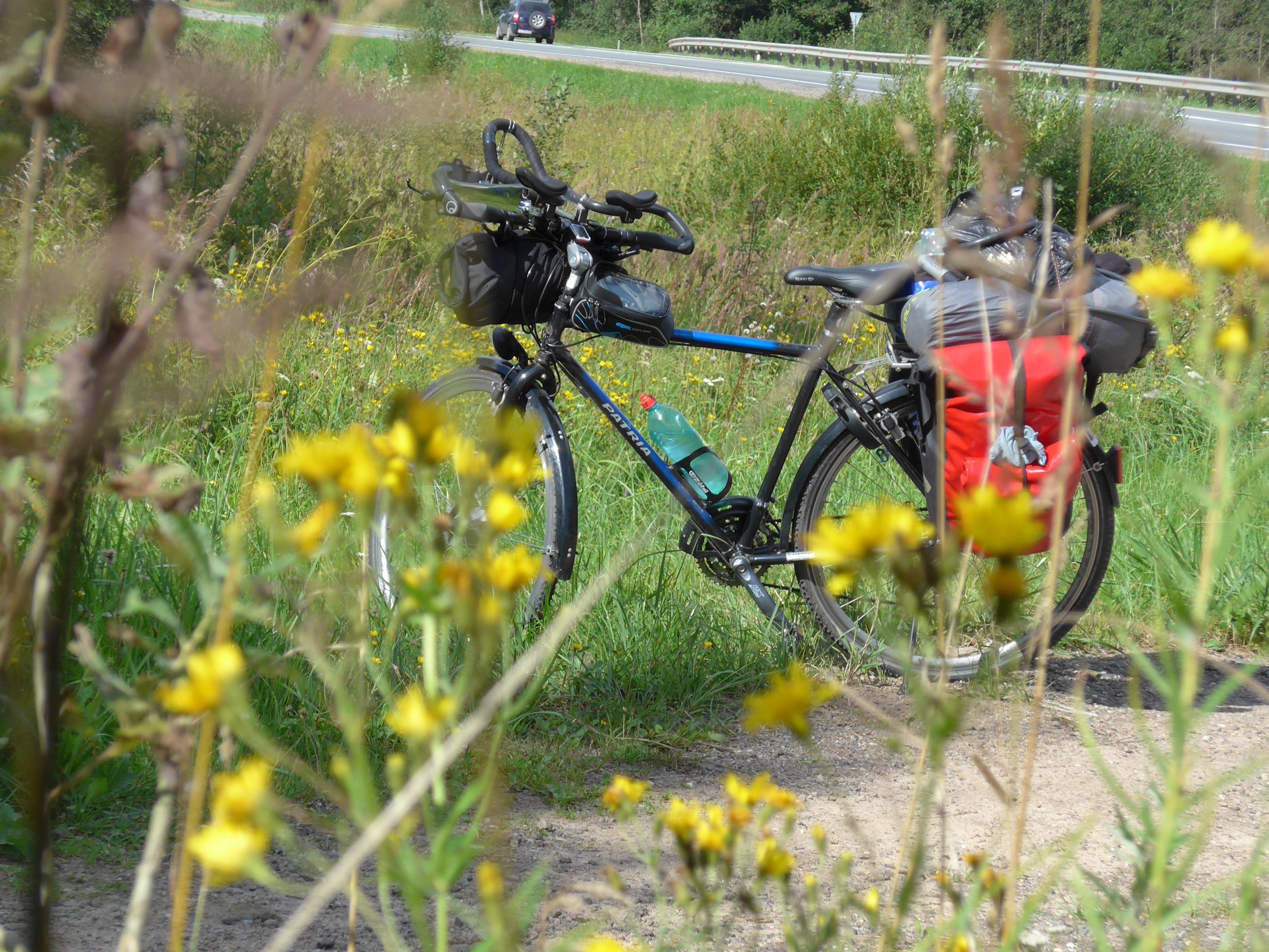 Schon kilometerlang davor Laster, aber geparkt auf dem Seitenstreifen. Leute bummeln herum. Als ich um ca. 13.00 Uhr an der Grenze ankomme, stehen gerade mal drei Pkw vor mir. Ich soll vorbeifahren, sagt der letzte in der Reihe. Ja, gerne. Nur ein paar Minuten warten, und schon wird mein Pass begutachtet, Zettel rein und weiter, was sich bestimmt 10x wiederholt. Immer wenn du denkst, das war’s, geht’s weiter. Autos werden am Ende auch noch mit einem Spiegel am langen Stiel überall und besonders auch von unten inspiziert…Nach insgesamt 30 min dann für mich freie Fahrt auf feinstem Asphalt. Wunderbar flitzt das Rad auf der M9. Die „Autobahn“ ist aber nur zweispurig und jeder darf hier fahren. So viel Ruhe auf einer derart gut ausgebauten Straße habe ich aber noch nicht erlebt: Alle 10 min höchstens kommt ein Auto oder ein LKW vorbei, schneller geht das Abfertigen an der Grenze sonntags anscheinend nicht. Ich fahre und fahre einfach dahin. Bäume, Sträucher, ein paar Blumen, Vögel, kleinere Seen, ein Fluss ab und zu … Besonders abwechslungsreich ist es nicht, aber auch nicht langweilig, einfach schönes Zufahren ohne Störung.